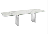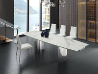 The ALLEGRA extendable xl motorized dining table in white marbled porcelain top on glass with polished stainless steel base by Talenti Casa features clean, modern lines adding a sophisticated look and edge to any room.
