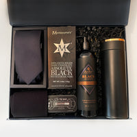 Men love gifts too. Our signature "Black and Blue Gift Box" curated gift box combines tasty black chocolate, self care essentials, a navy silk tie, 100% cotton black socks, a tempreture control mug all very eleganty boxed. Perfect for corporate and client thank you gifts and friends.